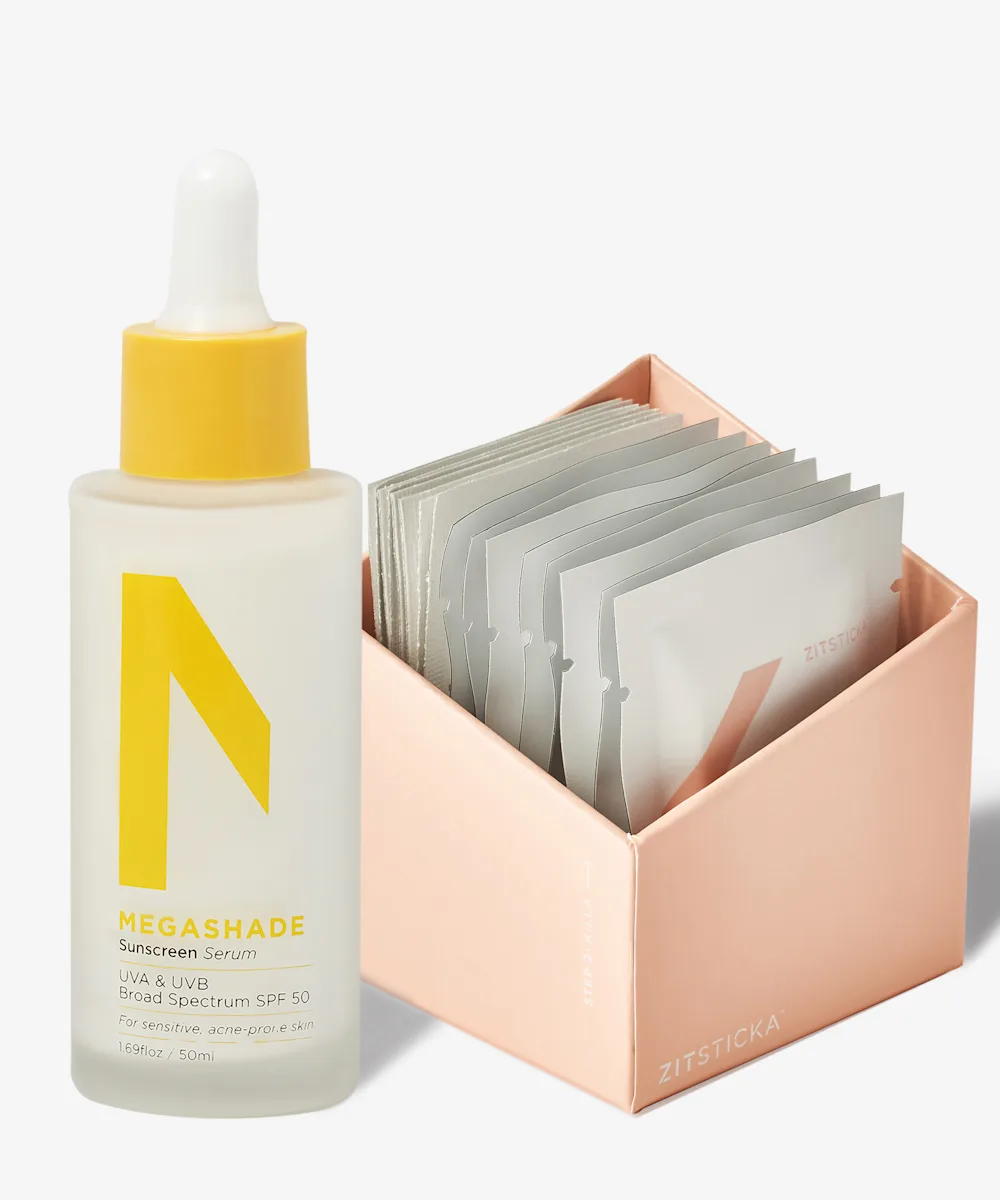 Make room in your skincare routine for the Zitsticka KILLA™ & MEGASHADE™ Duo. Inside this two-piece skincare set you’ll find a box of eight microdart spot patches and eight cleansing wipes that helps to cleanse and clarify breakouts for clear finish, plus a radiance boosting SPF 50 serum that blocks sun damage from harmful UV rays while leaving an invisible, all day glow.